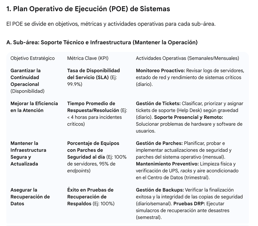 Elaborar un Plan Operativo de Ejecución (POE) para un área de Sistemas que abarque tanto Soporte Técnico como Desarrollo de Software requiere detalle para alinear las operaciones diarias con los objetivos estratégicos. Dado que el área de Sistemas del Coveicydet es pequeña, aquí describimos un plan detallado de actividades y los pasos para su elaboración, estructurado bajo el marco de un ciclo de planificación anual.